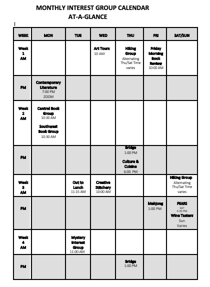 Whether your interests lie in reading books, checking out new restaurants, going on art tours, playing Bridge with friends, we may have an Interest Group that meets your needs. Check out the fun activities our members are involved with – you’re sure to find something that interests you. Note that new ideas are always welcome, with board approval.